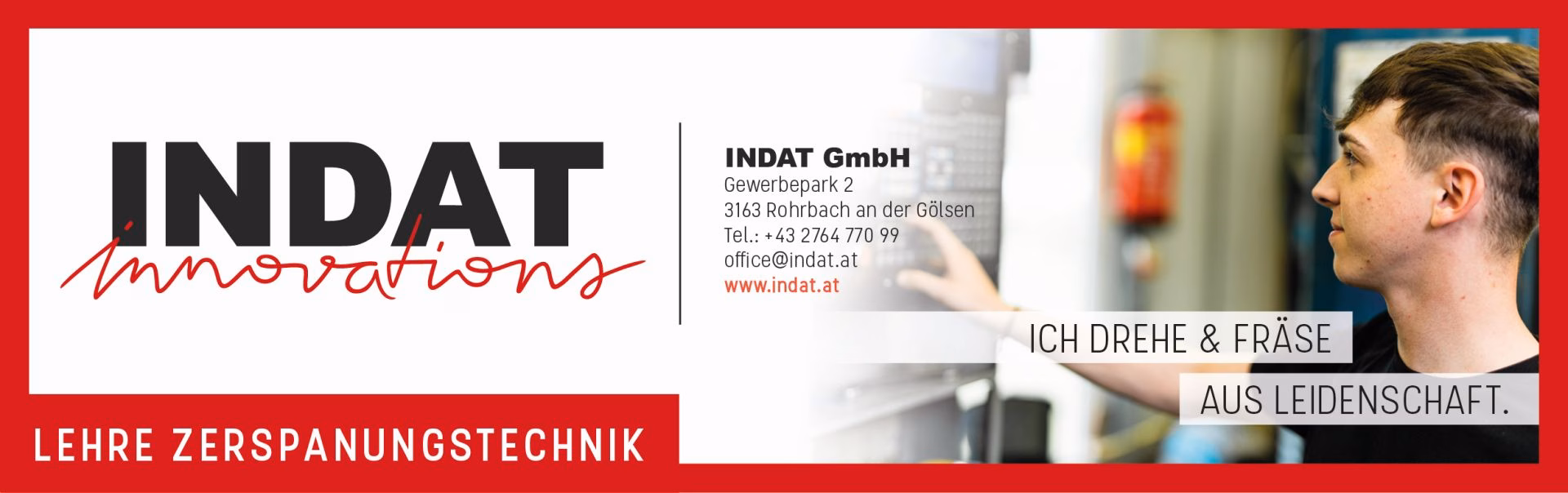 Du möchtest einen spannenden Beruf mit Zukunft erlernen? Fräsen und Drehen sind für dich keine Fremdwörter? Du interessierst dich für CNC-Maschinen? Du bist auf der Suche nach einem Job, der dir Freude bereitet? Dann ist die Abteilung CNC bei INDAT genau das Richtige für dich! Wir freuen uns über deinen Lebenslauf und dein Motivationsschreiben per E-Mail an bewerbung@indat.at.