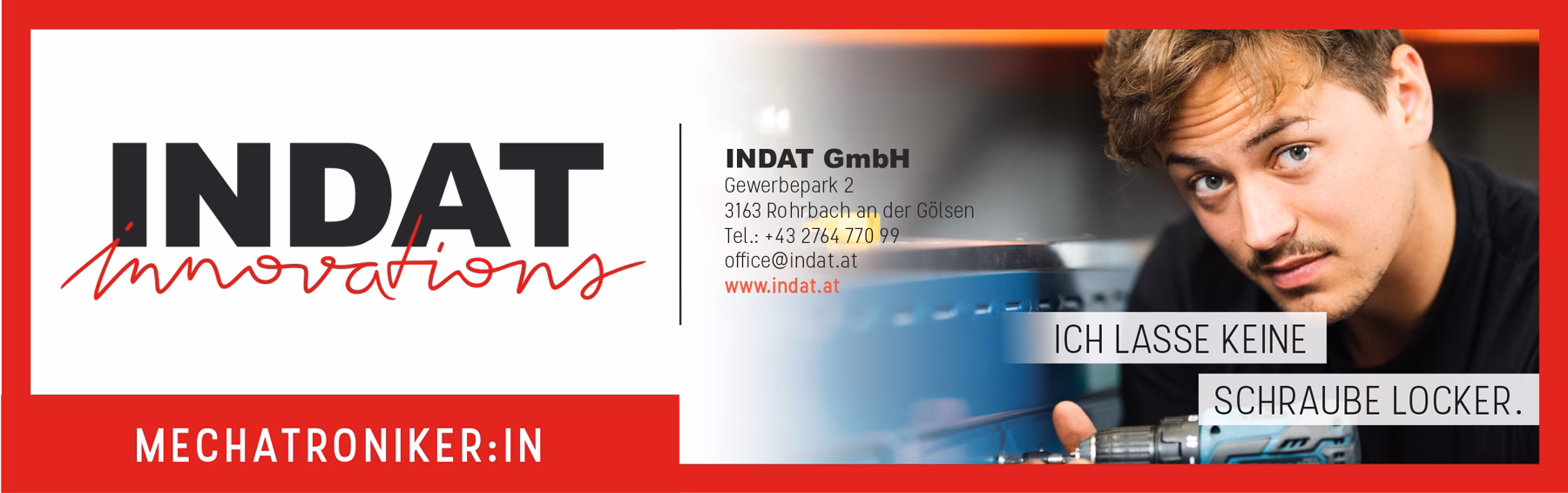 Du bist strukturiert und gibst dich mit Freude der Automatisierung von Sondermaschinen, Roboterzellen und Biegezentren hin? Innovative Lösungen sind dein Spezialgebiet und du bist technisch begabt? Dann ist die Abteilung Sondermaschinenbau der Firma INDAT genau das Richtige für dich! Wir freuen uns über deinen Lebenslauf und dein Motivationsschreiben per E-Mail an bewerbung@indat.at.